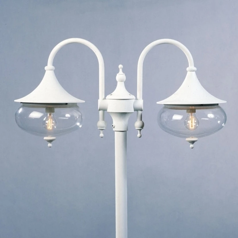 2-bulb aluminium lamp post Libra with large, clear acrylic glass shades Classic aluminium lamp post with 2 large lampshades that hang on decorative, curved arms on both sides and guarantee excellent illumination thanks to the clear acrylic glass.