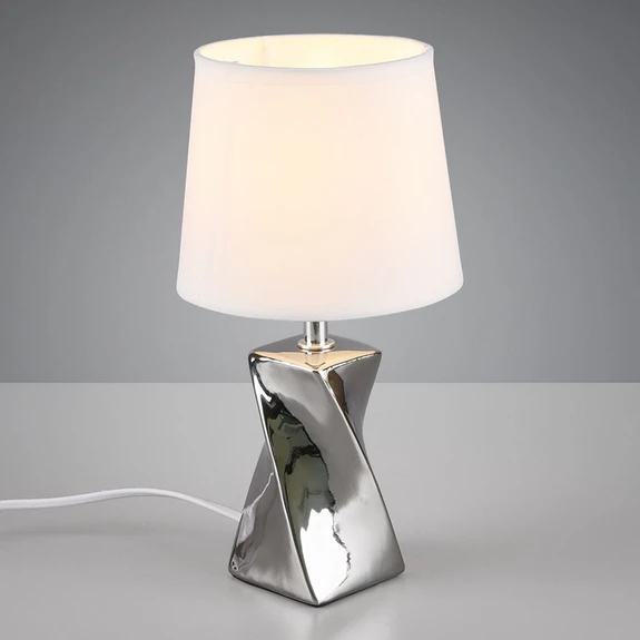 Decorative eye-catcher - Abeba ceramic table lamp The Abeba table lamp is an eye-catcher on any dresser or side table, as its square lamp base is twisted and has a glossy finish. A classically cut lampshade made of white textile sits enthroned on top, while the material mix of ceramic and fabric is harmoniously coordinated and suits many furnishing styles. Abeba is an attractive additional lighting feature in the living area and a decorative eye-catcher. Matching The matching bulb is available as an accessory.