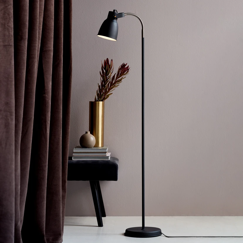 Adrian floor lamp in Scandinavian design The Adrian floor lamp made of metal has a very delicate and simple design. It is perfect as a reading lamp and harmonises with many furnishings. The upper section of the frame can be adjusted using the flexible section, and the metal lampshade of the light can also be swivelled in the bracket and fixed in the desired position using the two wing screws on the right and left. Through the openings in the wing screws, a little light also shines out of the side of the lampshade, setting it centre stage. A foot switch in the cable makes operation convenient.