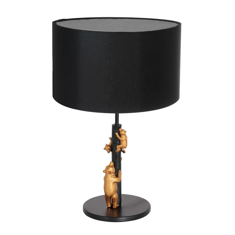Animaux table lamp with bear family on the base and linen lampshade This black table lamp with a linen lampshade features a family of bears cavorting on the frame that rises from the round lamp base, the golden colour creating a beautiful contrast to the black base and lampshade. The table lamp can be fitted with a bulb with an E27 socket as required and is switched on and off using the toggle switch integrated into the cable.