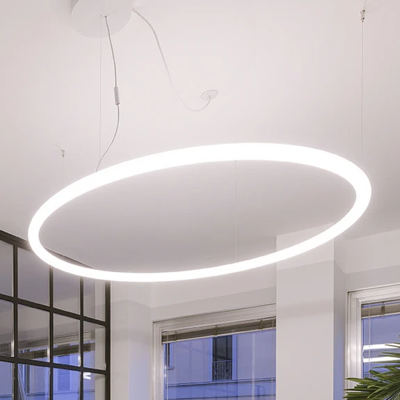 Circular LED pendant light Alphabet of light circular - a design product by Artemide With its circular light element, this LED pendant light is a further link in the chain of the lighting series of letters, numbers and lines conceived by BIG - Bjarke Ingels Group - which can be used to create countless lighting scenarios in both private and public areas. The circular pendant light is equipped with lighting technology based on a patented optoelectronic and mechanical process developed by the manufacturer Artemide, which diffuses the light into the room. This also creates a very cosy atmosphere wherever Alphabet of light circular is used. The Bjarke Ingels Group BIG is an association of architects and designers who are committed to technical awareness in their projects while at the same time conserving resources. The Alphabet of light luminaire series reflects this. Their first project was the Harbour Baths in Copenhagen in 2003 - the transformation of the run-down harbour promenade in the Brygge Islands area into a recreational and social centre for the city. This was followed by the 8 House (2010), Superkilen (2012) and the Danish Maritime Museum. Current projects include: 57th West (a 750-unit residential building in Manhattan), the Vancouver House Tower, the LEGO Brand House in Denmark and the FARO Education Centre. The lighting company Artemide has been headquartered in Pregnana Milanese (Italy) since its foundation in 1960 and pursues the philosophy of human light in its products, i.e. to create design products that are oriented towards people's needs. Artemide is represented in over 98 countries around the world with its product range.