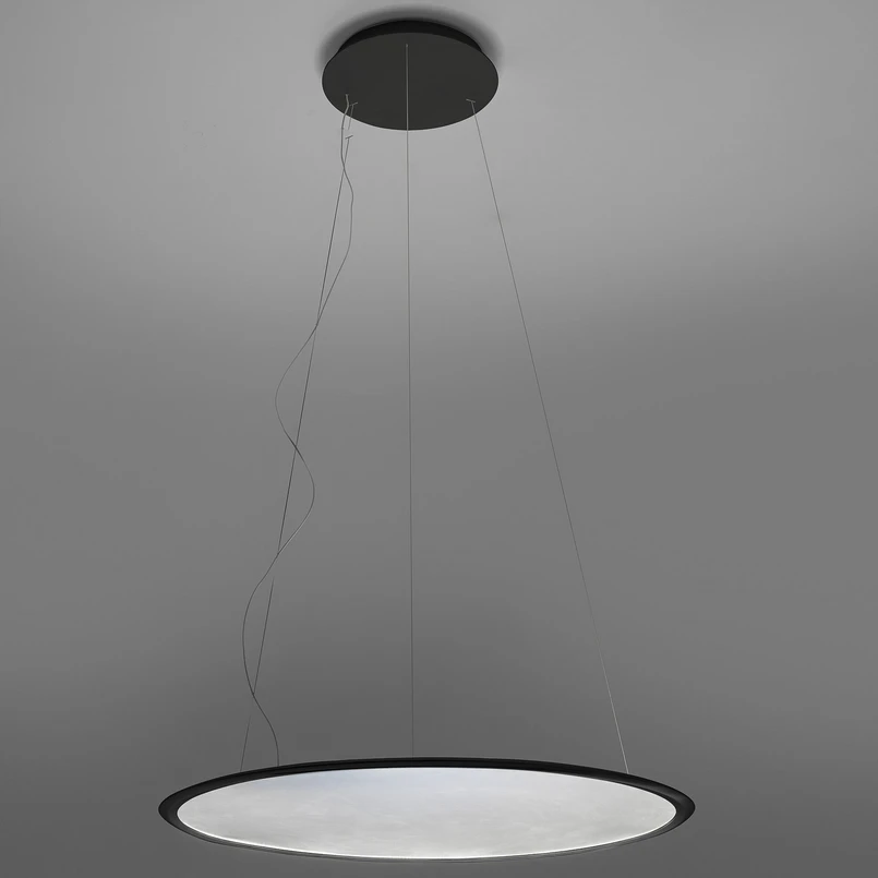 Discovery LED pendant light with horizontally aligned lampshade When unlit, the Discovery LED pendant light blends almost unobtrusively into any living environment. As soon as the lighting is switched on, Discovery gains visual volume. The large round surface made of technopolymer ensures wide-spread room illumination, which is particularly effective in a working environment. This innovatively designed LED pendant light is the creation of the Italian designer Ernesto Gismondi, founder of the lighting company Artemide in Pregnana Milanese in Italy, which has been synonymous with top quality design products since the year it was founded (1960).