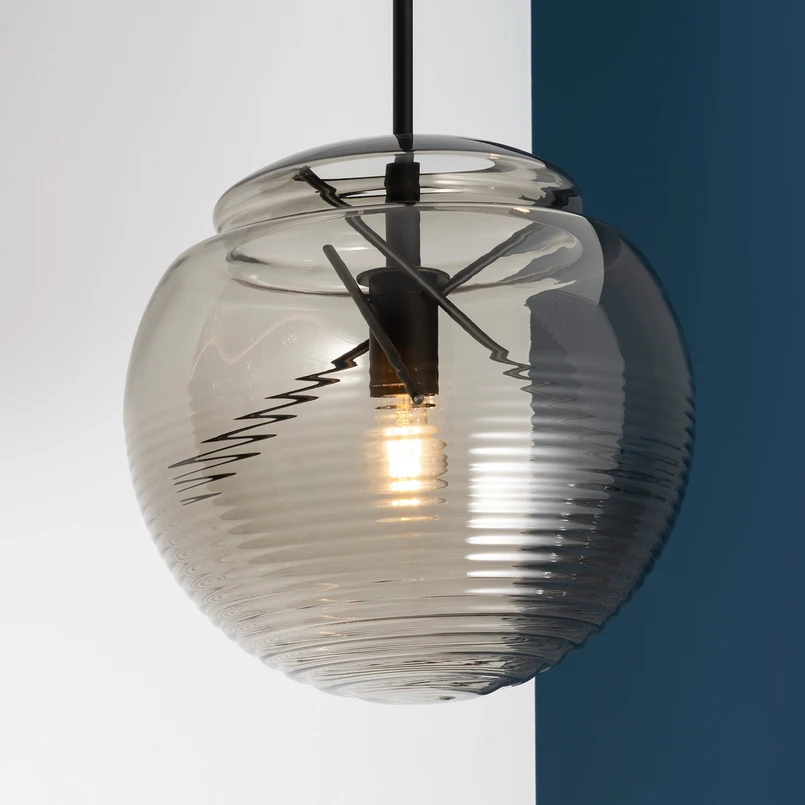Vitruvio pendant light with mouth-blown Glas lampshade The Vitruvio pendant light is particularly eye-catching thanks to its unusually designed lampshade. It is transparent and made of mouth-blown Glas. Visually, it is reminiscent of a Kokon or a beehive. Horizontal strips have been embossed into the form, concealing the light source inside and at the same time ensuring glare-free emission and even distribution of the light to its surroundings. Three movable metal struts are inserted into the lampshade for suspension and stabilisation, which are opened by a mechanism inside. This creates a structure that supports the Glaskugel and balances and safely carries its weight. Decorative bulbs with a filament look are particularly suitable for illuminating the hanging light, as the bulb can be seen through the glass lampshade and its special appearance can further enhance the attractiveness of the pendant light. The light can be dimmed using an external leading and trailing edge phase dimmer and a dimmable bulb. The projects of the Atelier Oï designer group are characterised in particular by their sophisticated design and high quality. The issue of sustainability also plays a major role, with sustainable materials and traditional manufacturing processes being given particular consideration. These values are supported by the lighting manufacturer Artemide. The Vitruvio pendant light combines Tradition with a future-orientated, modern focus.