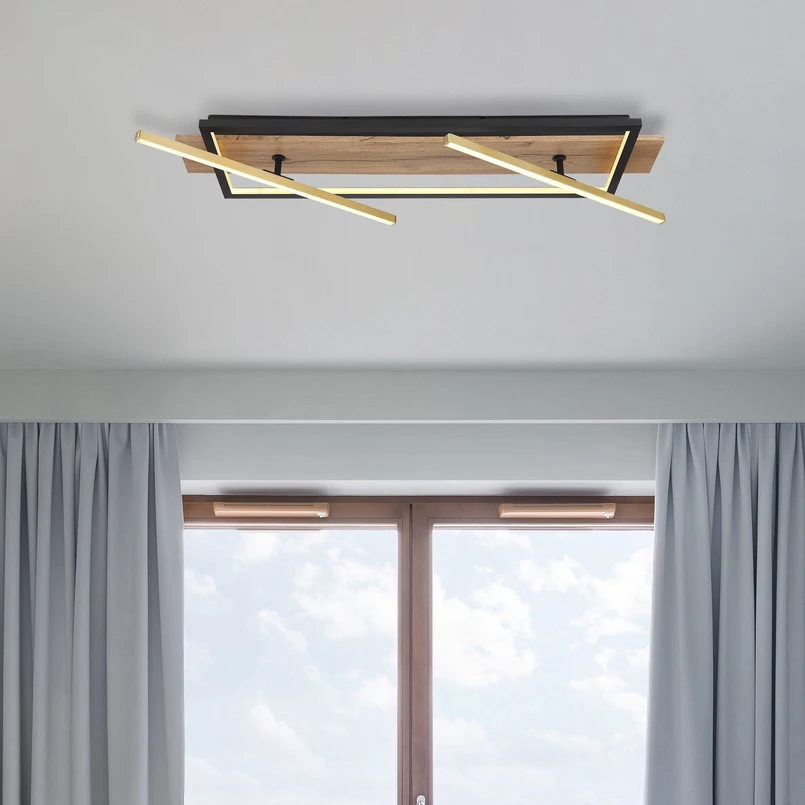 3-bulb LED ceiling light Beatrix Matt black metal housing, dark MDF wood and brass-coloured aluminium rods add a touch of luxury and elegance to any room. The combination of matt black aluminium and opal plastic produces a soft, glare-free light that creates a pleasant atmosphere. With its unique function via the wall switch, the lighting can be adjusted in several stages. The Beatrix ceiling light has a memory function, can be rotated and swivelled and offers 3 levels: 1. only the rods illuminated, 2. only the inner frame illuminated, 3. both together.
