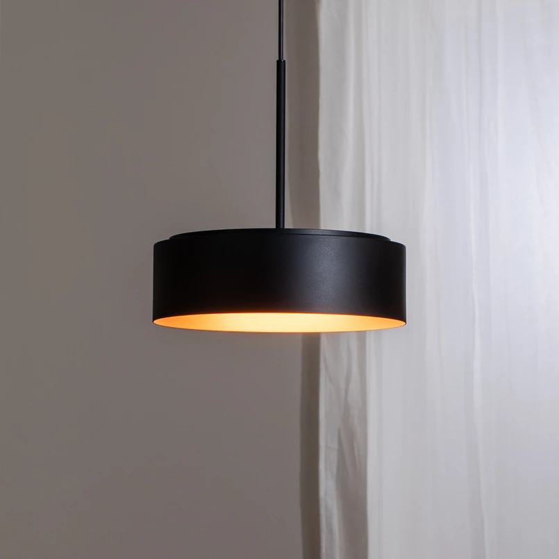 Studio Line LED pendant light, cylindrical shade, DALI ballast This very robust Studio Line LED pendant light is equipped with an impact-resistant plastic cover and a metal housing for downward-directed, glare-free light and is ideal as a light source above the dining table or in the kitchen. Warm white LEDs have been installed in the lampshade and the light is equipped with a DALI ballast. The aluminium luminaire housing is painted velvet black on the outside and matt copper on the inside. The domed cover made of impact-resistant, opal white plastic ensures glare-free and very uniform light distribution.