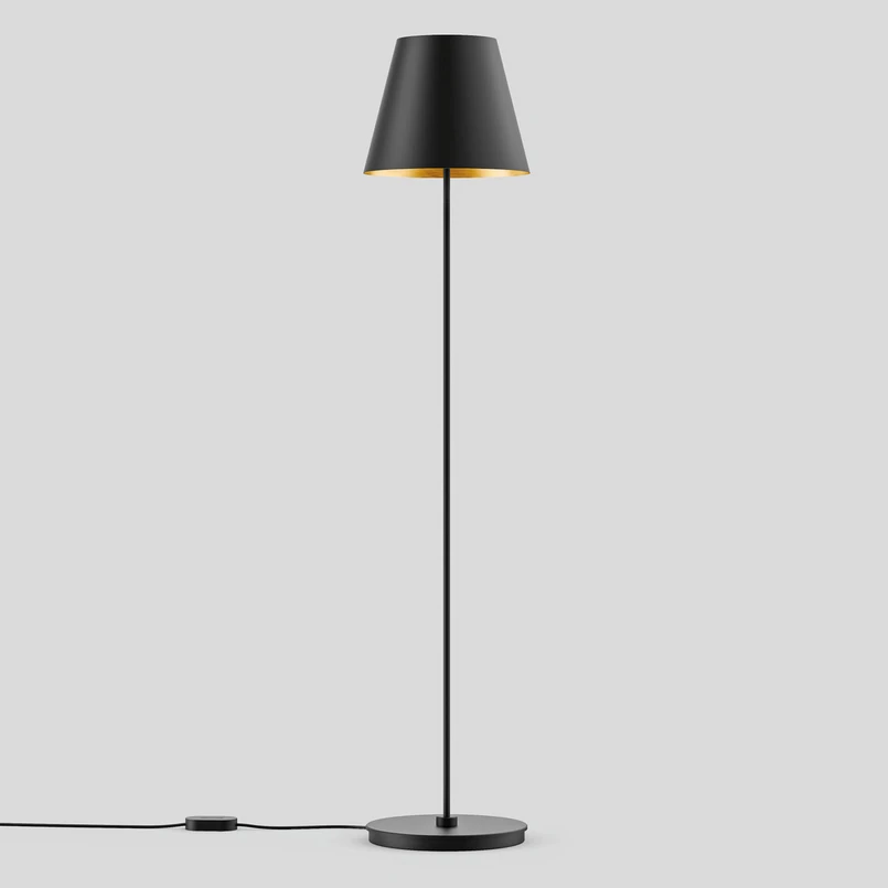 The LED floor lamp Studio Line comes in restrained black. Only the inside of the shade is kept in brass; this, however, takes a clear influence on the lighting effect, which thereby turns out particularly warm. The design with vertically open truncated cone shade, slender frame rod and round base is absolutely timeless. The black plug cable is equipped with a foot dimmer, in order to be able to regulate the stately light output if necessary on the desired measure.