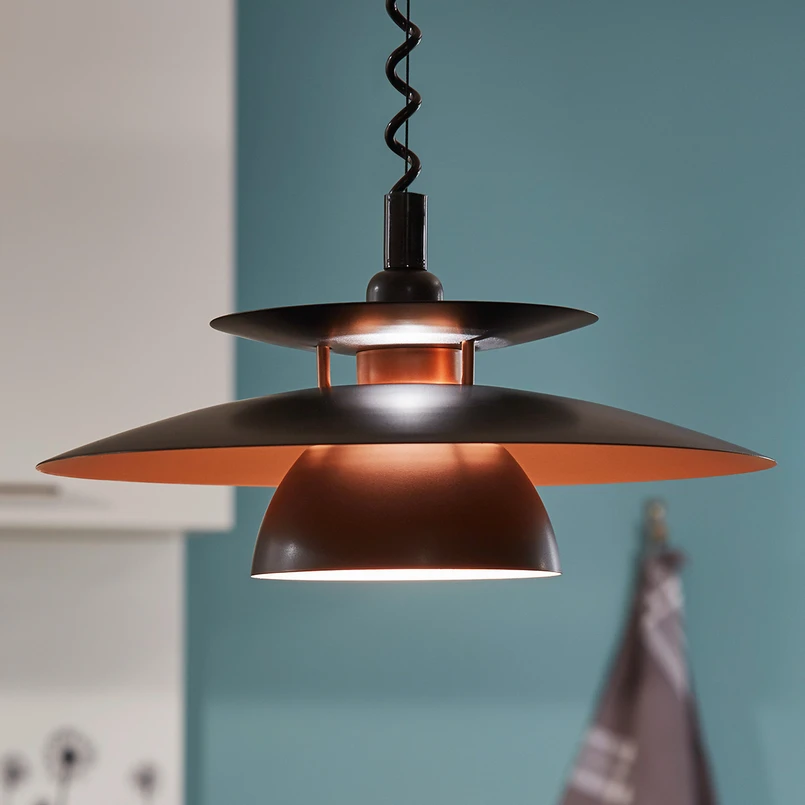 The Brenda hanging light stands out thanks to its design and flexibility. The hanging light's lampshade has been fashioned in tiers of steel: the upper side is a matt black colour, whilst the underside comes in a stylish copper tone. This combination helps to create a unique light effect. The spiral cable means that the Brenda hanging light can be hung at various heights – the maximum cable length is 110 cm. The Brenda hanging light cuts a fine figure, especially above kitchen tables or bars: After all, if it is in the way, it can be simply pushed upwards.