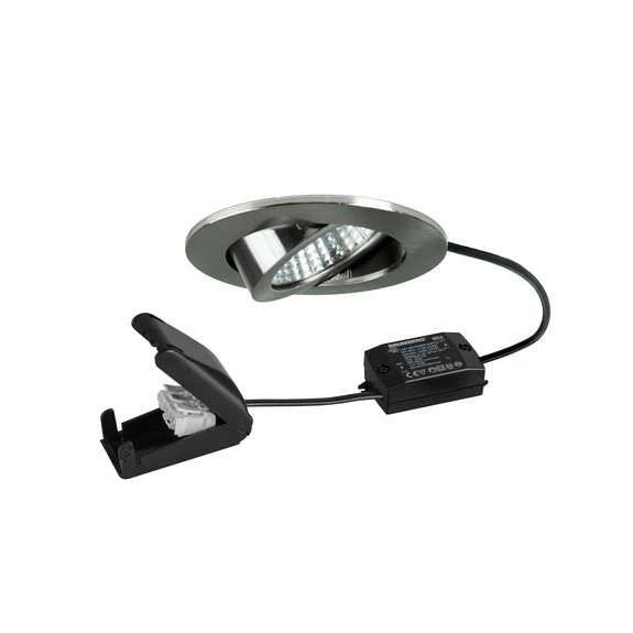 Round LED recessed spotlight BB03, swivelling, with connection box and LED driver The BB03 LED recessed spotlight, made of aluminium in a round shape, is equipped with warm white LEDs. These are placed in a head that can be moved to all sides, allowing the light to be directed as required. Equipped with a silver reflector with rotationally symmetrical, narrow-wide beam light distribution and a transparent polycarbonate cover, the light is optimally distributed. The simple appearance harmonises with modern furnishing concepts; BB03 is the ideal downlight above the kitchenette and in hotel corridors. It can be installed without tools thanks to installation springs and is equipped with a connection box - including non-dimmable LED converter - beam angle: 38° - swivelling range: 30° all round - must not be covered with thermal insulation material
