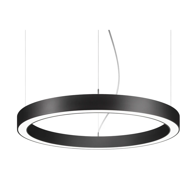 Biro Circle Ring LED pendant light, shade height 10 cm, Ø 75 cm, switchable An aluminium ring forms the shade of the Biro Circle Ring LED pendant light from BRUMBERG, which hangs directly from the ceiling on filigree steel cables so that it almost appears to float in the room thanks to the barely visible steel cables. The LEDs installed all around the ring emit powerful and optimally distributed light downwards thanks to the rotationally symmetrical deep-wide light distribution and an opal white plastic cover. The Biro Circe Ring LED office hanging light is specially designed for lighting offices and conference rooms, but can also effectively and evenly illuminate the dining table in the home - general colour rendering index CRI > 80 - service life L70/B50 at 25 °C: 276,000 h, service life L80/B20 at 25 °C: 153,000 h - housing material: aluminium / steel / plastic - permissible ambient temperature (ta): -20 °C - +25 °C - with electronic control gear, switchable, not dimmable