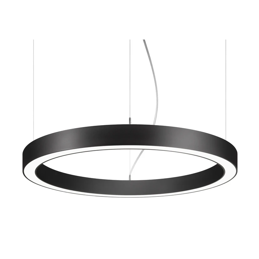 Biro Circle Ring LED pendant light, Ø 75 cm, up/down 30/70, switchable The LEDs in the Biro Circle Ring pendant light emit 70% of their light downwards and 30% upwards through the opal white covers. The ring-shaped lampshade is made of aluminium and is suspended directly from the ceiling on fine steel cables without a canopy, so that it appears to float in the room. The pendant light is equipped with a switchable, non-dimmable electronic ballast. It is not only suitable for offices and conference rooms, but can also be used to illuminate many other commercial areas uniformly, effectively and brightly - Light distribution 70 % direct, 30 % indirect - With rotationally symmetrical, wide-angle light distribution - General colour rendering index CRI > 80 - Lifetime L70/B50 at 25 °C: 276.000 h, service life L80/B20 at 25 °C: 153,000 h - housing material: aluminium / steel / plastic - permissible ambient temperature (ta): -20 °C - +25 °C - with electronic ballast, switchable