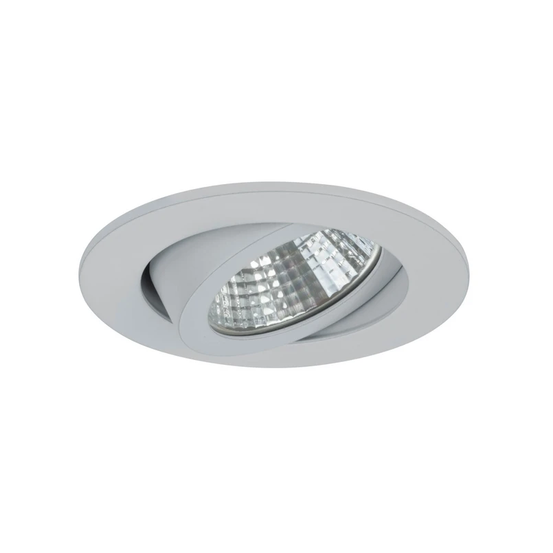 LED recessed ceiling spotlight Seven-R made of aluminium The round LED recessed ceiling spotlight Seven-R is suitable for tool-free ceiling installation using installation springs and fits into ceilings with a maximum thickness of 1.3 cm. An LED driver is required for connection to 230 V, which is not supplied. The spotlight made of Massive aluminium is equipped with a silver reflector with rotationally symmetrical, narrow-wide beam light distribution and a cover made of transparent plastic and emits warm white light at an angle of 38°; it can be swivelled by 30° in the housing so that the light cone can be aligned - permissible ambient temperature (ta): -20 °C - +25 °C - for connection to an external ballast, which is not included with the light