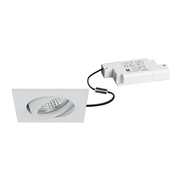 Tirrel-S LED recessed spotlight with trailing edge dimmable ballast The square Tirrel-S LED recessed spotlight made of Massive aluminium is supplied ready for connection including dimmable ballast (trailing edge - RC) and can be mounted in ceilings up to 1.5 cm thick without tools using installation springs. High luminous efficiency and optimum light distribution are ensured by the silver, highly specular reflector with rotationally symmetrical, narrow-wide beam light distribution and a transparent glass cover - general colour rendering index CRI > 80 - permissible ambient temperature (ta): -20 °C - +25 °C - protection class (EN 61140): II, IP code (DIN EN 60529): IP20 - with electronic ballast, phase cut-off dimmable - swivelling by 20° - without visible snap ring
