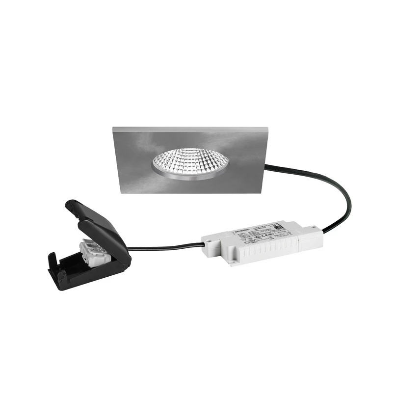 Recessed LED downlight BB21 with LED driver Trailing edge phase cut-off (RC)-dimmable and connection box The LED downlight BB21 is perfect for wellness areas, bathrooms and many other damp rooms in private or commercial areas. It is supplied with an LED driver and connection box and provides warm white lighting, which is emitted by the silver reflector with rotationally symmetrical deep-wide beam light distribution through the transparent plastic cover at an angle of 36°. With IP code IP65 dustproof and protected against water jets, the recessed downlight can also be installed in showers etc. It can be mounted without tools using installation springs and can be installed in ceilings with a thickness of up to 1.7 cm - including electronic ballast, trailing edge dimmable (RC) - with connection box, 3-pole for through-wiring - permissible ambient temperature - 20 to 25 °C - must not be covered with thermal insulation material - high IP code IP65