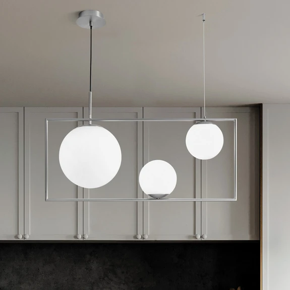 Buble pendant light in a brushed steel finish with three opal glass spheres The Buble series of lamps, designed by Italian architect and designer Davide Negri, is characterised by the differently sized, spherical opal glass lampshades, which are placed within a rectangular metal frame. This pendant light is fitted with three lampshades, each of which houses a socket and provides soft light on all sides. The metal frame and the round canopy have a brushed steel finish.
