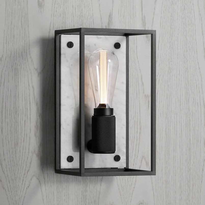 In rectangular basic shape, the wall lamp Caged Wall medium was designed; an open cuboid of metal struts frames the socket and the bulb to be inserted (not included). It is recommended to use the matching lamp from the manufacturer (see accessories). The back wall is closed with a marble plate, which gives the lamp a noble touch.