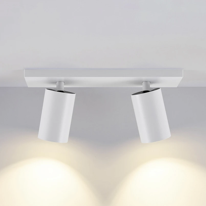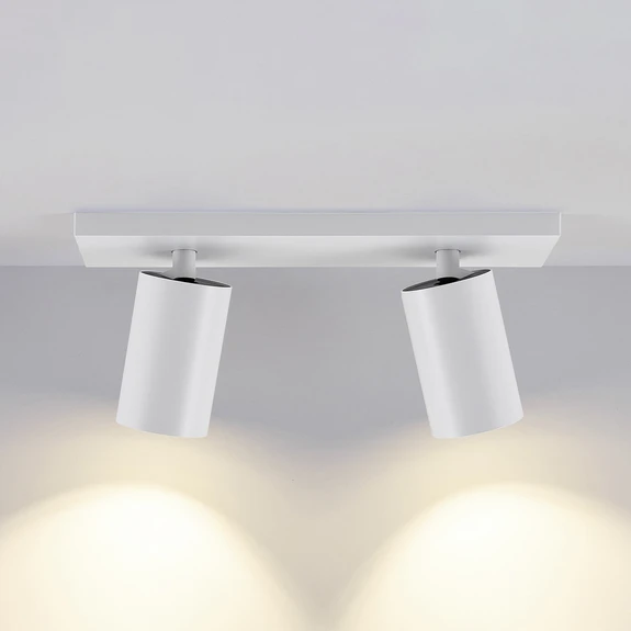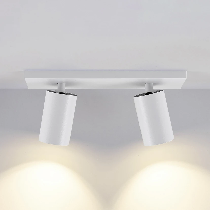 The CAN TILT ceiling spotlight, made of aluminium in a single-colour, neutral design, is extremely versatile for area and general lighting. Two cylindrical heads are mounted below the rectangular canopy and can be rotated and swivelled. Each is equipped with a GU10 socket – the bulbs to be used are in a recessed position.