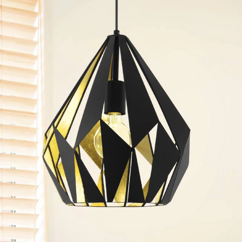 The extravagant design of this hanging lamp Carlton in vintage style, in addition to appealing appearance, provides a special lighting design. In the openly designed lampshade geometric figures - gold inside and black outside - join together to form a diamond. The illuminant (not included) remains visible through the gaps. If a dimmable bulb is used, the lamp can also be dimmed. Thus, an individual room light can be created. In addition, the lamp provides changing light and shadow play in the room due to the integrated shapes. With this effective light pattern, the pendant lamp Carlton is suitable, for example, for the living room or bedroom. It can be optionally equipped with LED or energy-saving lamps.