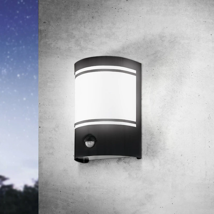 Black, timeless Cerno outdoor wall lamp with sensor The Cerno outdoor wall lamp consists of a curved steel body in black and a white satin-finished glass light surface. Due to the splash water protection (IP44), it is suitable for outdoor use without hesitation. The luminaire is equipped with a motion sensor and switches the light on automatically. This illuminates areas that are difficult to see and deters uninvited guests. The integrated twilight sensor measures the ambient brightness and only switches on the light when it is really necessary. Thanks to the timeless design, the wall luminaire fits into a wide variety of styles in the outdoor area. Whether terrace, balcony or house entrance - it illuminates every area safely, reliably and without glare. - Sensor angle 90° - Sensor brightness: 2 - 2000 lux - Sensor duration: 10 - 240 sec - Detection range: 7 m