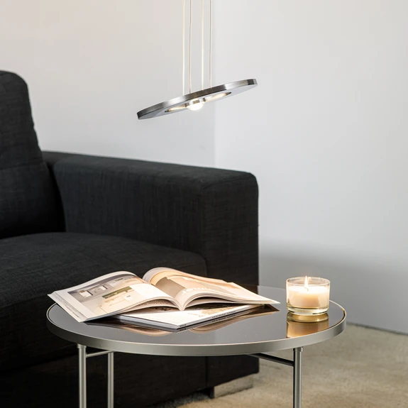 Passepartout25 LED pendant light with central asymmetry The Passepartout25 LED pendant light consists of a flat metal ring with an opening in the centre. The metal ring is attached via four cables to the canopy, which is also round and made of metal. The edge of the light unit is made of polished aluminium, while the cover plate is available in different finishes. The LED light unit is mounted asymmetrically within the opening in the centre of the plate. The diffuser used here enables a glare-free and targeted cone of light from the downlight, while the uplight projects a wide cone of light onto the ceiling. The symmetry of the light, which is broken up by the attached lighting element, emphasises the modern design of the light and creates a very special overall appearance, for which the Italian designer and art director of Cini&Nils, Luta Bettonica, is responsible - trailing edge dimmable