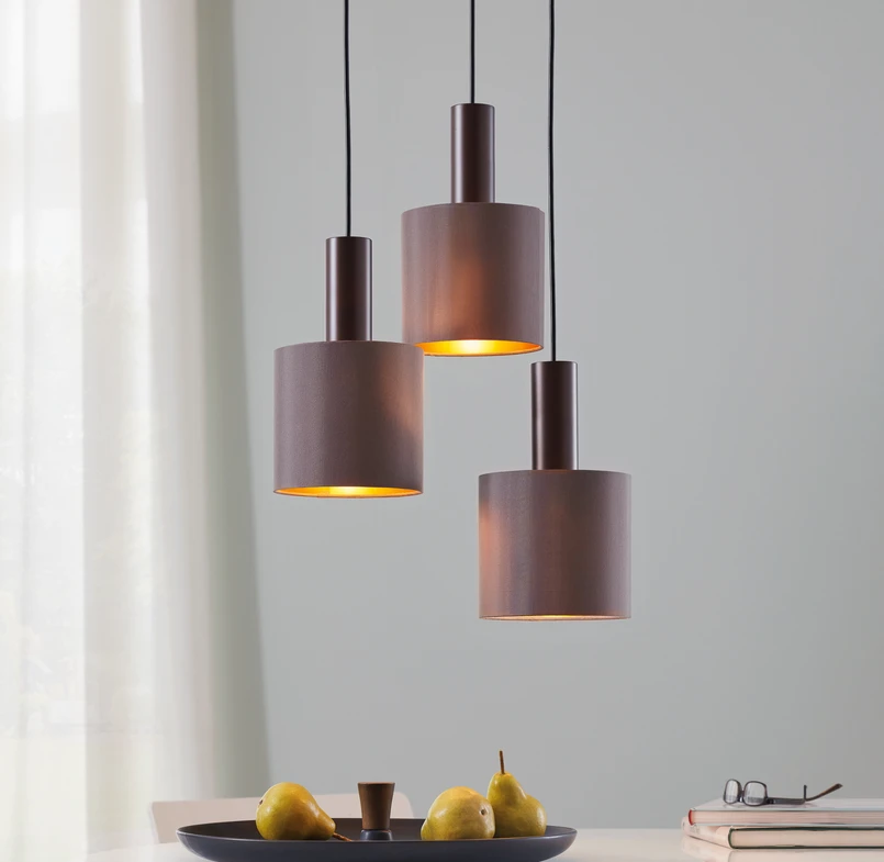 With the pendant luminaire, numerous living rooms are stylishly rounded off. The timeless shape of the lamp and its elegant appearance make it an absolute eye-catcher. The lamp optimally illuminates the kitchenette or dining table and surprises with delicate accents in gold. The dark brown design of the lampshades also harmonises perfectly with the likewise brown cables and the round bracket on the ceiling.