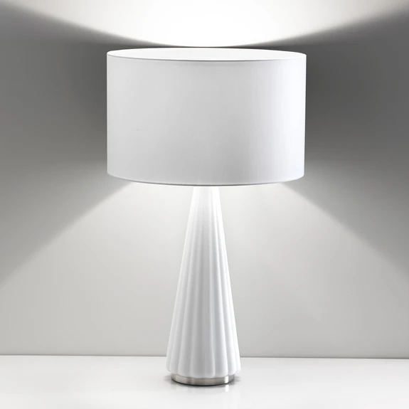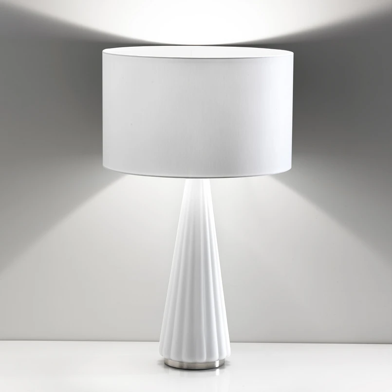 The base of the lamp is tapered towards the top and is made entirely of mouth-blown glass. The glass has a grooved surface, which gives the appearance of the lamp a modern touch. The lamp design is rounded off with a wide textile lampshade that directs the light of the lamp upwards and downwards and allows only a faint light to shine through the textile.