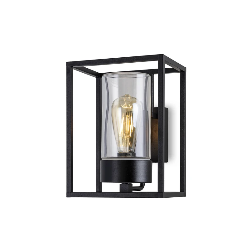 Entrance areas, terraces and many other areas can be effectively illuminated with the angularly designed Cubic³ outdoor wall lamp in black. Through the transparent glass cylinder that surrounds the illuminant, it radiates unobstructed in all directions and illuminates an extensive area. The glass cylinder is surrounded by an angular body of black metal struts. In the transparent glass cylinder of the lamp, a filament lamp looks particularly beautiful (not included).