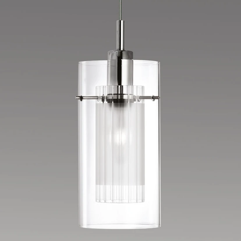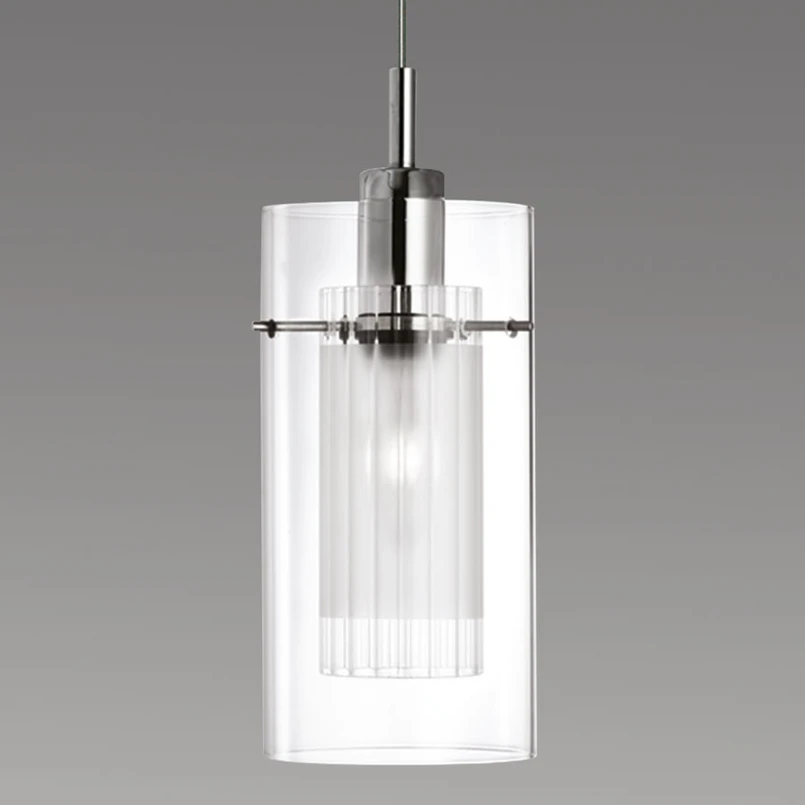 The pendulum, with its exceptionally-attractive glass shade, protrudes downward from a chrome ceiling rosette directly below the room ceiling. The glass shade, made of two cylindrical lampshades, was designed in an effective and attractive manner. The outside is made of clear glass and the inside is made of frosted glass and therefore covers the light bulb. Energy-saving light bulbs can be used without affecting the appearance of the hanging light’s outside appearance.