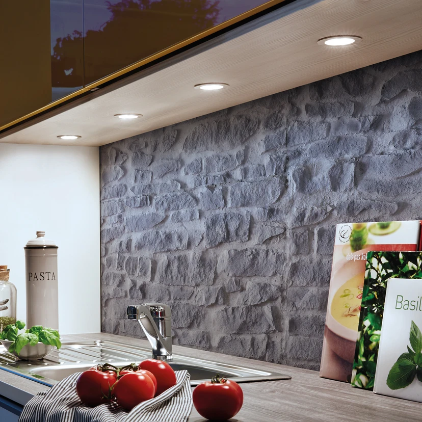 With the recessed luminaire Dynamic FR 55, the kitchenette and, thanks to its IP44 protection rating, the bathroom can be set in scene with light accents. It is equipped with an energy-saving LED whose light colour can be adjusted between warm white (2,700K) and universal white (5,000K). The luminaire is equipped with a 2.5m long connection cable with dynamic plug and is easy to install. An LED transformer DC 24 V is required for commissioning the light. Due to its nature, the recessed light is also suitable for sheet metal mounting.