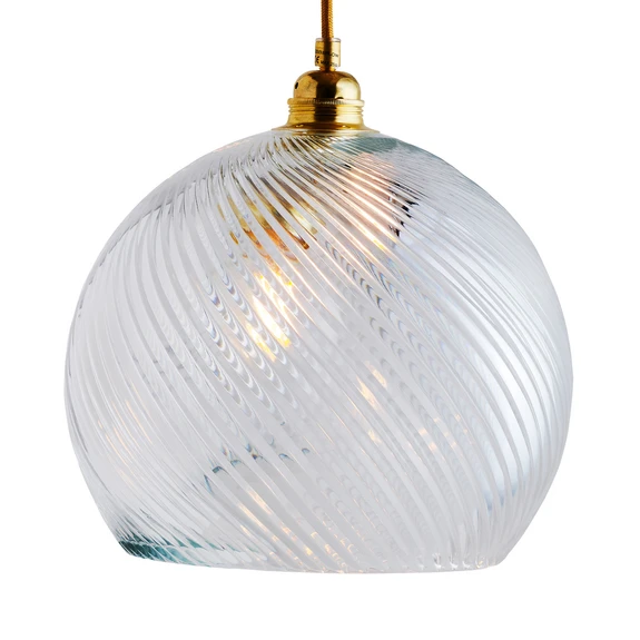 The Rowan pendant lamp is a jewel for any room, even when it is not lit. Its shade is made of mouth-blown glass, in which a decorative swirl pattern has been incorporated, which gives the light radiation a special flair. Due to the socket and suspension made of metal in a warm gold tone and the also gold-coloured textile cable, the Rowan pendant lamp receives a festive touch and the emitted light a cosy shimmer. This decorative pendant lamp can be excellently used as a light source above a table in the dining room or as basic and area lighting for living room or bedroom.