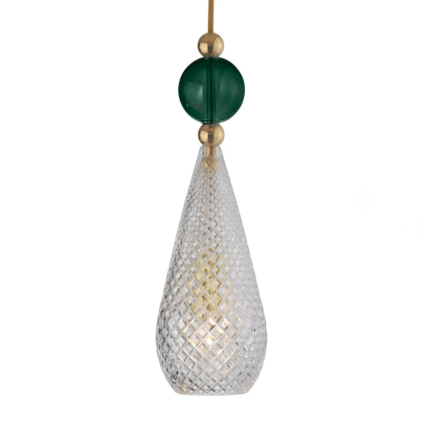 Outstanding design meets an exquisite combination of materials in the Smykke pendant lamp: the shade is made entirely of crystal glass patterned with checks, the sphere sitting on the suspension is made of mouth-blown glass. The colour combination of transparent and ivy green is also striking. The suspension is decorated with gold-coloured details and fitted with a metal rod with bulb holder, also painted gold, which reaches deep into the crystal glass shade and remains visible all around thanks to the clarity of the glass. To complete the aesthetic, we recommend the use of decorative light sources, such as filament lamps, which can be ordered from the accessories.