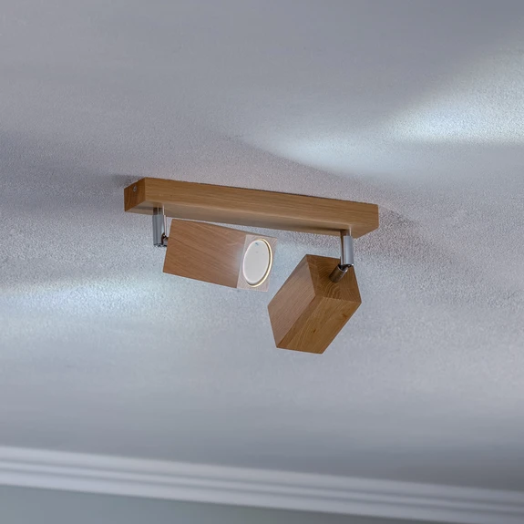 Two-light Peach Puff ceiling spotlight made of light-coloured wood in cuboid shape The Peach Puff ceiling spotlight made of wood and manufactured in Europe is a flexibly adjustable light source with a natural radiance for dry indoor areas. The two heads in the shape of cuboids are positioned below a rectangular canopy and each has a round opening on the underside, which is sized to fit a 5 cm Ø, 5.6 cm long bulb.