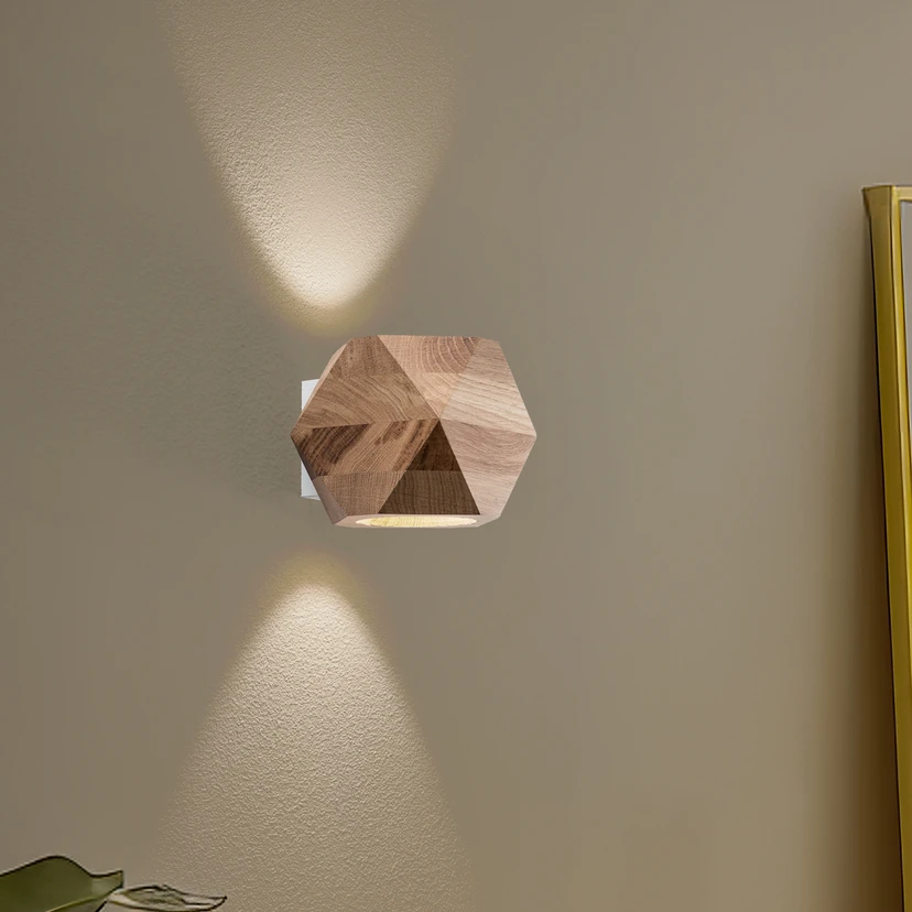 Peach Puff wooden wall light - designed as a polygon, shining above and below The Peach Puff wall light from European production can be used in a variety of ways thanks to its compact dimensions and impresses with the natural radiance of the light-coloured wood. It is characterised by its shape with different angular surfaces that form a regular polyhedron. Light is emitted through two openings at the top and bottom - maximum dimensions of the light source to be used: Ø 5 cm, length 5.6 cm