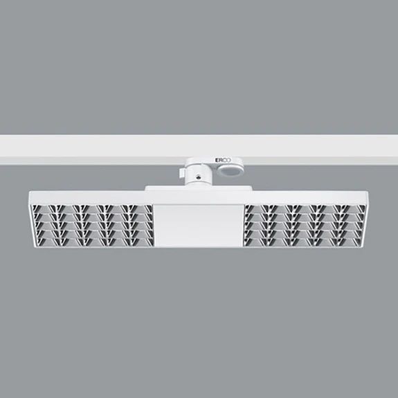 LED louvre light Jilly from ERCO for 230 V three-circuit track - 15 W LED, with rotary dimmer, oval wide flood light distribution (83° / 61°) The Jilly track light impresses with its excellent flexibility: it can be dimmed both with its own rotary switch and externally and can also be used above computer workstations in offices thanks to its very good glare control. Thanks to a special lens system made of optical polymer and a anti-glare louvre, the light is emitted very broadly, with the beam angle differing in the longitudinal and transverse directions; in combination with the 360° rotatability on the track adapter, the light can be perfectly aligned for a double workstation, for example.
