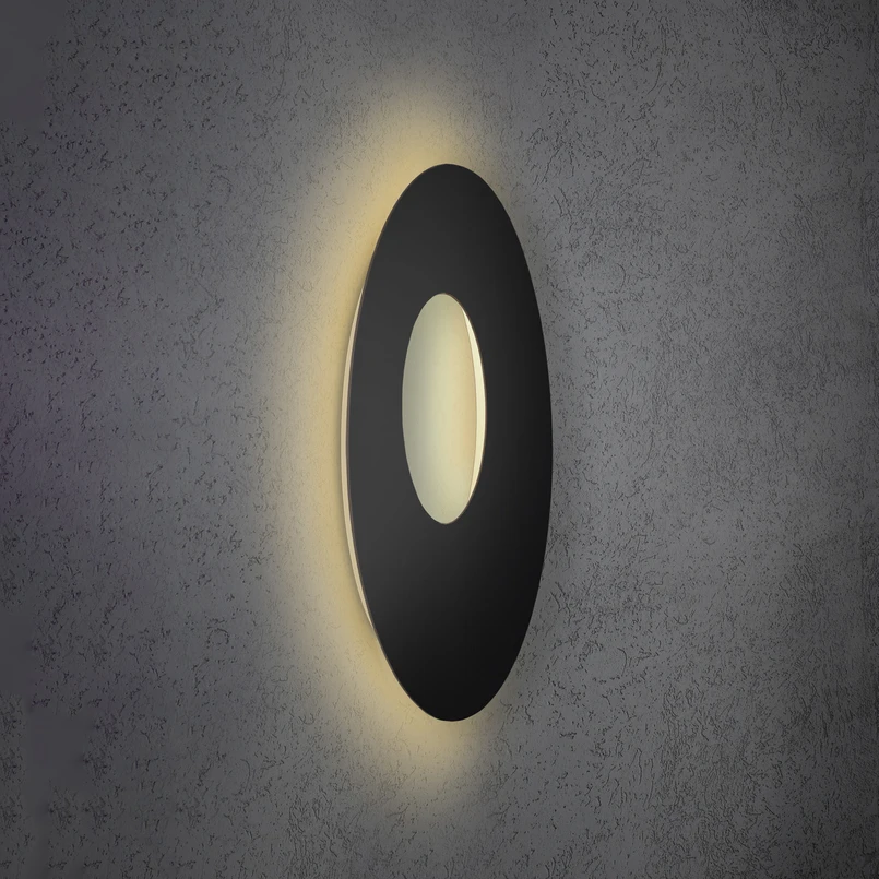 Modern Blade LED wall light for a distinctive lighting concept The Blade LED wall light is equipped with a circular curved LED module that is installed behind a round decorative aluminium plate. The off-centre, round opening in the decorative plate gives the design a playful look, which breaks up the precisely round shape and at the same time allows a direct view of the LED module. The built-in LEDs emit a pleasant, warm white light, creating a cosy atmosphere in any room. The indirect light is cast onto the wall, giving the impression that the light is floating in front of the wall. It is also equipped with a dimmable LED driver (Triac dimmable), which allows the brightness to be regulated and varied externally using a trailing edge dimmer. Whether in private or public areas - the Blade wall light can be used in the living room at home as well as in business premises, hotels, restaurants, museums and galleries for effective additional lighting. The LED light can also be used not only as a wall light, but also as a ceiling light. This design object can be used to decoratively complement rooms with modern furnishings and create a striking lighting concept - externally Triac dimmable - indirect light - can be used as a wall light or ceiling light