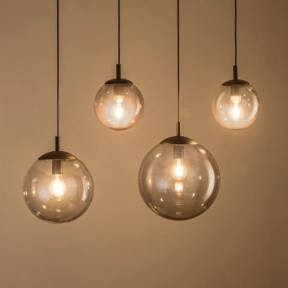 Esme glass pendant light with four graphite grey spherical shades in a row The Esme pendant light appeals with its four spherical lampshades, which are designed in different sizes and lined up next to each other. The shades have a graphite grey tint and provide a view of the bulb to be used. The brackets, cable and canopy are finished in black.