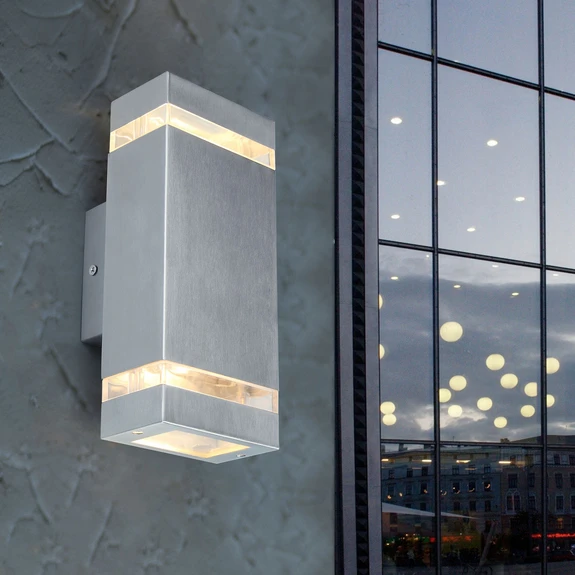 The Focus wall light consists of a stainless steel block that is open at the top and bottom, with narrow light slots incorporated into the sides. This illuminates the wall beautifully at the top and bottom, while the side slots also provide good orientation lighting. The elegant shape and design stand out beautifully against textured exterior walls.