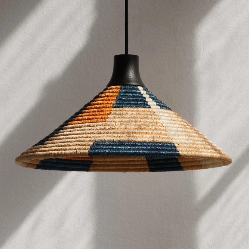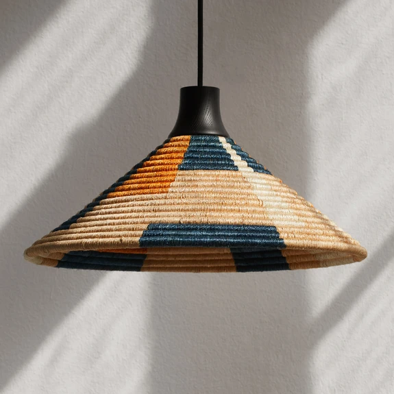 The shade of the pendant lamp Parrot S becomes an eye-catcher in the living area due to its unusual design and color scheme. It is made of rattan and abacá and is composed of superimposed narrow ropes. The textile cable and the metal canopy were designed black. The pendant lamp was designed by product designer Jette Scheib, who was fascinated by the diversity and cultural influence of the design of baskets. The Parrot series of lamps is designed to highlight the colorful and expressive side of basket culture.
