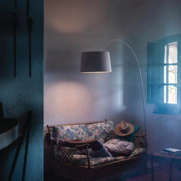 Curved Twiggy Wood arc floor lamp with wooden shade On the one hand, the Twiggy Wood arc floor lamp offers the possibility of equipping living spaces with appealing area lighting and, on the other, serves as a trendy furnishing accessory that decisively characterises the living style with its timeless elegance. The Twiggy Wood lampshade is made of maple wood. Fibreglass encased in a composite material, plastic, painted metal and aluminium are the other ingredients for an incomparable design product manufactured by the Italian lighting company Fosacarini. Twiggy Wood is fitted with warm white LEDs that have a very good colour rendering index, so that colours and contours in the surroundings are reproduced very authentically. The integrated dimmer allows the brightness to be reduced as required. Twiggy Wood is the creation of designer Marc Sadler, who has extensive experience as an industrial designer in the sports industry. His innovative and experimental approach - he often experiments with new materials and innovative production methods - also benefits him when designing lights. Sadler has already received the Compasso d'Oro four times for his designs, including in 2001 for the Mite and Tite lights, which he created for Foscarini.