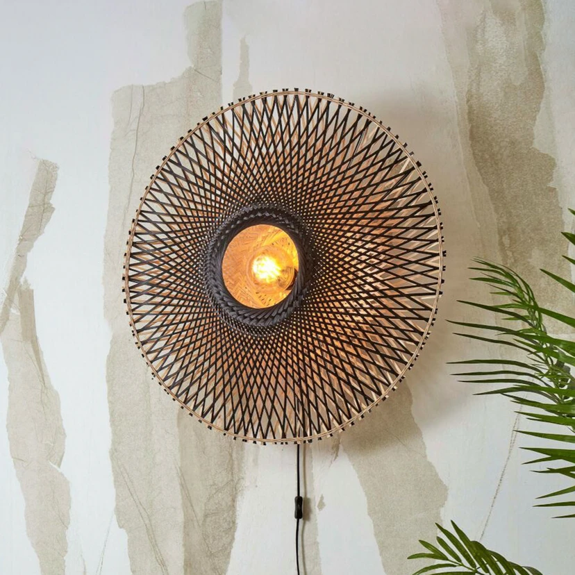Round Kalimantan wall light with cable and switch This round wall lamp is a unique lighting element that is made from natural materials and retains the same natural colouring. Kalimantan impresses with its woven lampshade made of flexible, sturdy bamboo, which is considered a sustainable material. The plant can be cut off again and again and grows back very quickly, it also produces a lot of oxygen and its texture is impressive. All the struts of the pattern run into the centre of the round light, where a circular recess has been incorporated. The bulb sits in this recess, is completely visible and emits the light directly. It also escapes into the body of the light, where it then shines through the gaps and creates a unique light pattern in the room. Kalimantan is connected via a plug-in cable with an integrated switch for effortless operation. Good & Mojo is a brand of the Dutch company It's about RoMi, which began working with sustainable materials in 2010. This project gave rise to the company's own sustainable brand Good & Mojo, which was launched on the market in 2016. Das is also involved in social projects and advertises the fact that a tree is planted for every product sold.