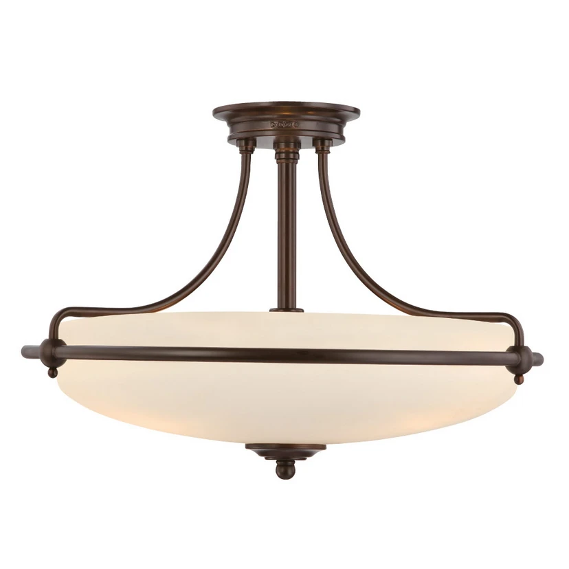 Griffin semi-flush ceiling light with bronze-coloured suspension system The Griffin semi-flush ceiling light is an eye-catcher in any room with a classic interior design. It is equipped with a round glass that has been painted white on the inside for optimum light reflection. Griffin provides bright, soft ambient lighting with a cosy character. Even when unlit, this beautiful light looks great, not least thanks to the bronze-coloured metal frame with curved arms.