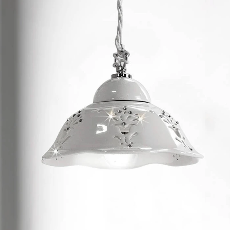 The canopy and the lampshade of the Guiliano hanging light are made of ceramic. The bottom edge of the lampshade has a slight wave, giving the lampshade an attractive soft finish. A pattern of holes is integrated into the lampshade itself, producing an attractive pattern on the surface of the lampshade in conjunction with the high-quality crystal details. A suitable light bulb can be ordered as an accessory.
