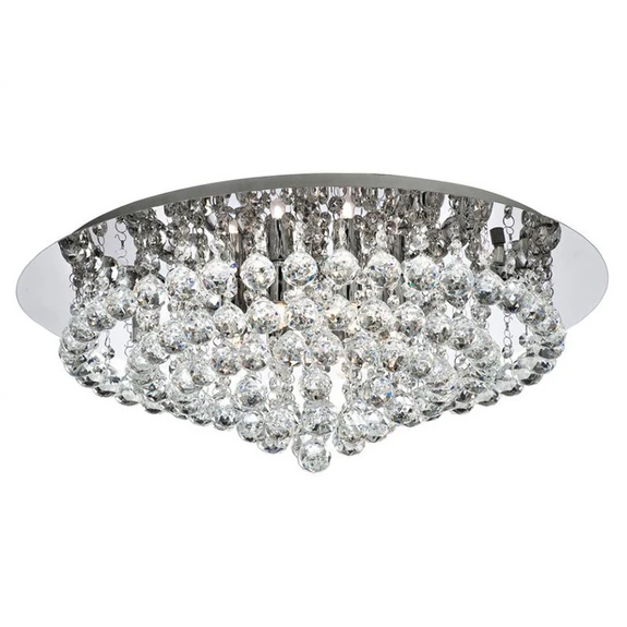 Hanna ceiling light with glass crystal pendant The graceful Hanna ceiling light not only impresses with its special lighting effect, but also with its visual appearance. A large number of glass crystals have been attached to a shiny chrome ceiling plate, which are individually designed like small spheres. The prism-like structure creates a pleasant and elegant sparkle when the light is switched on, while at the same time providing a good lighting effect for the entire living space. Whether in the living room or entrance area, the Hanna ceiling light is an immediate and glamorous eye-catcher.