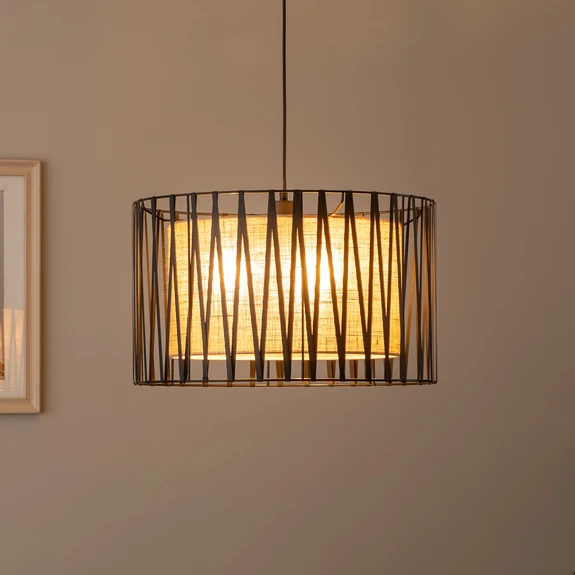 Black Harmony pendant light with inner shade made of jute textile The Harmony pendant light is made of black lacquered steel. The cylindrical lampshade consists of an outer sphere covered with ribbons and an inner element made of natural brown jute textile.