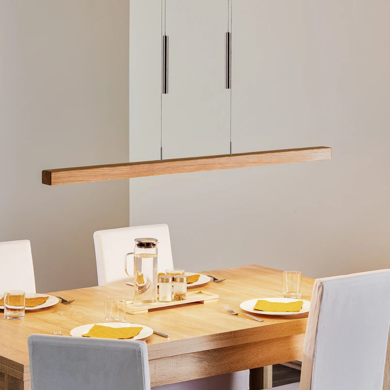The natural look of the Leonora beam light is ideal for modern living spaces and is a real eye-catcher above the dining table. Leonora features a metal frame with a matte nickel brushed finish, a handcrafted solid wood shade, and acrylic covers on the LEDs that provide glare-free illumination. The suspension height (95-160 cm) of the lamp can be ideally aligned via the tension weights.