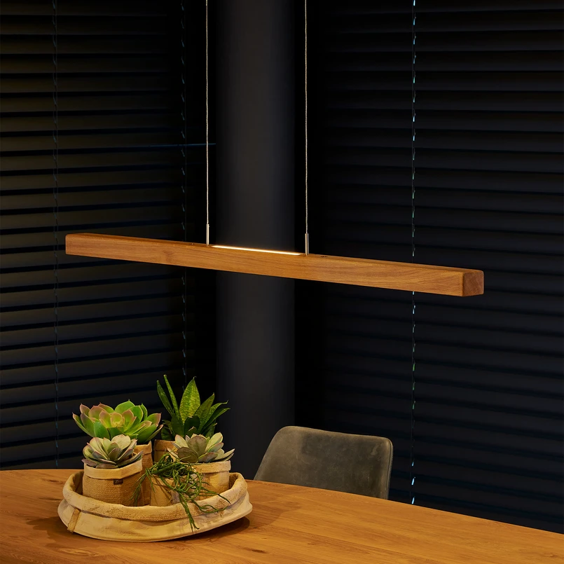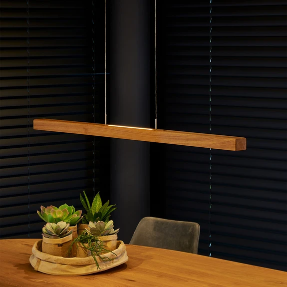Sustainably produced Leonora LED pendant light with dimmer function With its narrow spruce light bar and striking wooden structure, the Leonora LED pendant light will win over any wood lover. It is fitted with efficient LEDs and manufactured by hand, making it of the highest quality. The light is emitted upwards and downwards through satinised diffusers, making it an Ideal light source in the dining area. The brightness and light colour (dimmable to warm function) of the light can be adjusted as required. This can be achieved using the push-button integrated into the bar as well as the normal wall switch (switch-dimmable function). In addition, two discreetly designed rise and fall mechanisms ensure that the height of the light bar can be continuously adjusted (95-160 cm). From design to production and manufacturing, the HerzBlut manufactory ensures sustainable and low-emission production. High-quality lights are made from FSC-certified wood with great attention to detail.