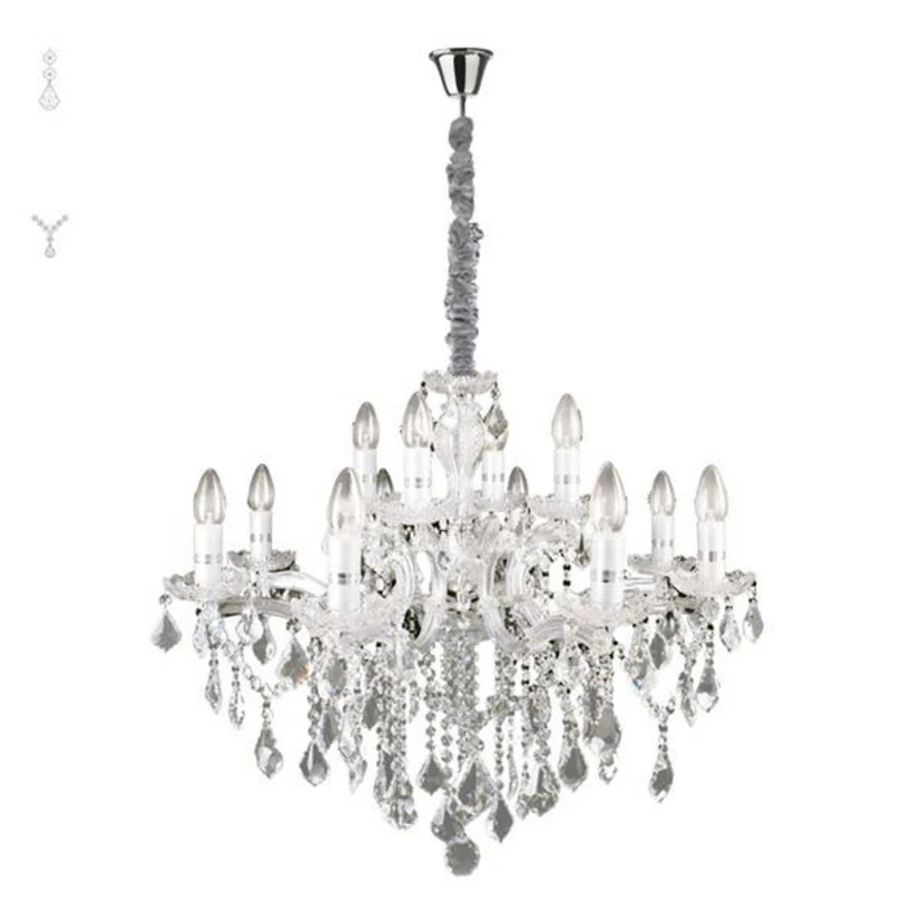 Opulent Florian chandelier with twelve sockets and crystal pendants The Florian chandelier fills the room with a sparkling spectacle of light. It has a chrome-coloured metal structure and 12 sockets designed as candle holders. Clear glass plates and numerous cut crystal elements make the Florian chandelier a special eye-catcher.