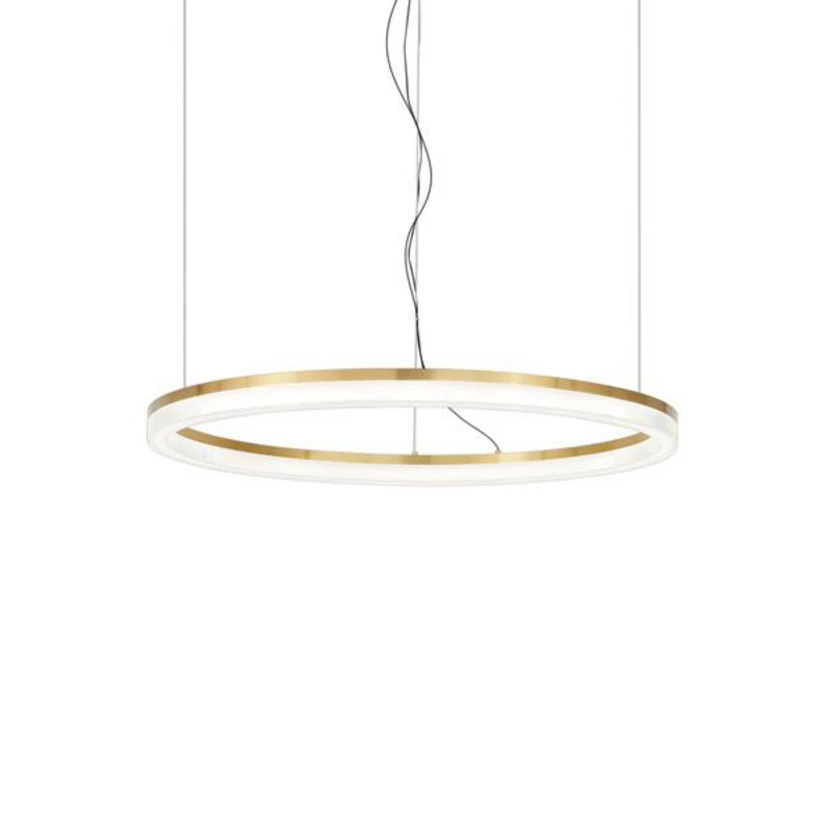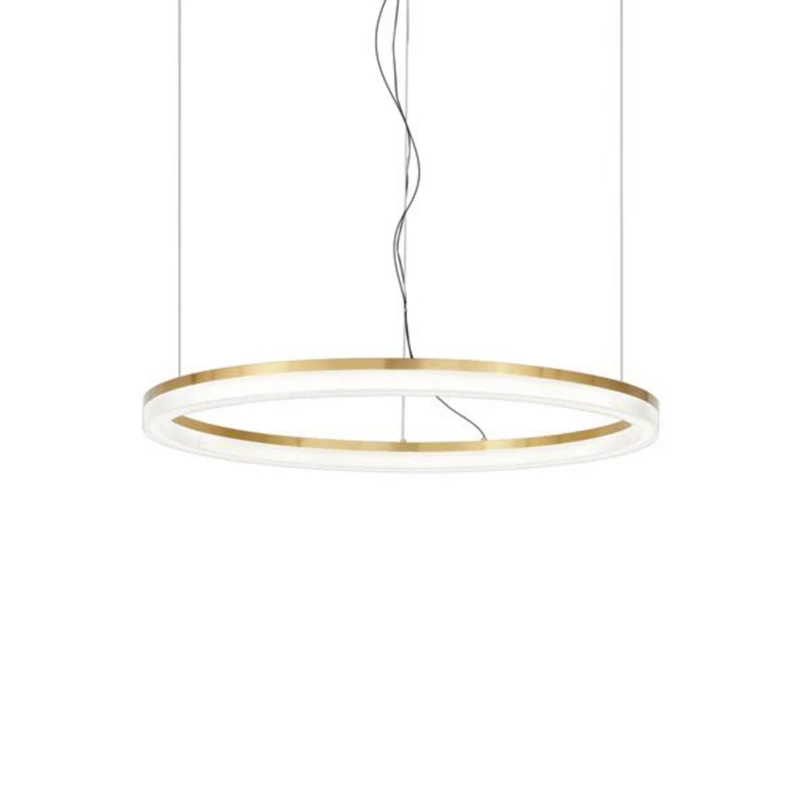 Ring-shaped Crown LED pendant light with a brass finish The Crown LED pendant light can be used not only above living and dining room tables, but also in prestigious public and commercial spaces. The metal body has a brass-coloured ring shape and is fitted with warm white LEDs on the underside. These are located above a structured glass cover that refracts and diffuses the light.