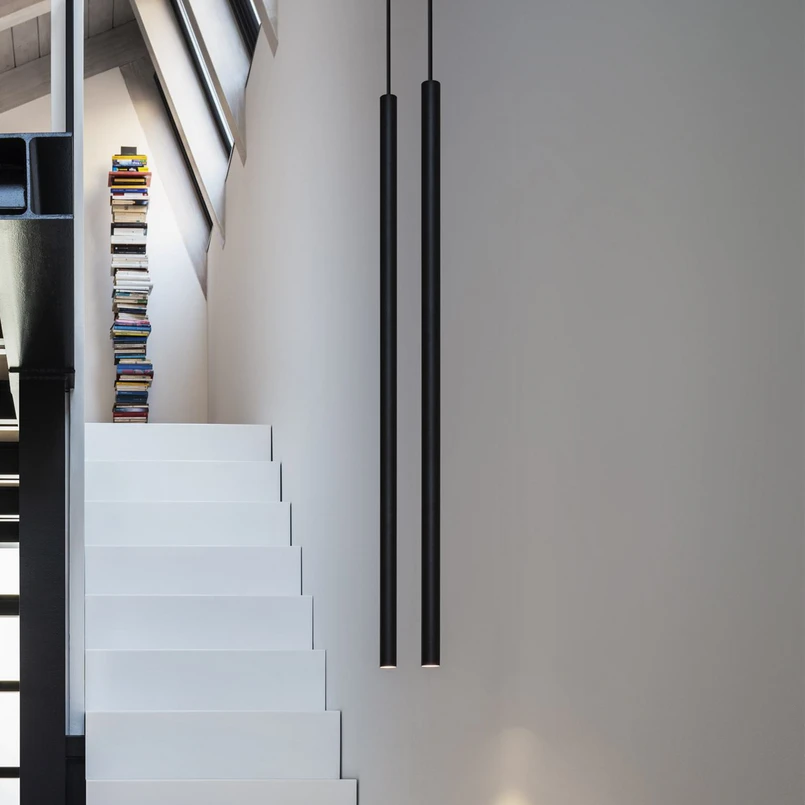 DALI-dimmable Ultrathin Round LED pendant light in a slim cylinder shape This pendant light already has a decisive visual feature in its name. The lampshade of the Ultrathin Round LED hanging light is extra slim and round in the shape of a tall metal cylinder. The light outlet is located on the underside, through which the warm white light from the integrated LED light source illuminates a table, counter or room area. Externally dimmable via DALI / Push.