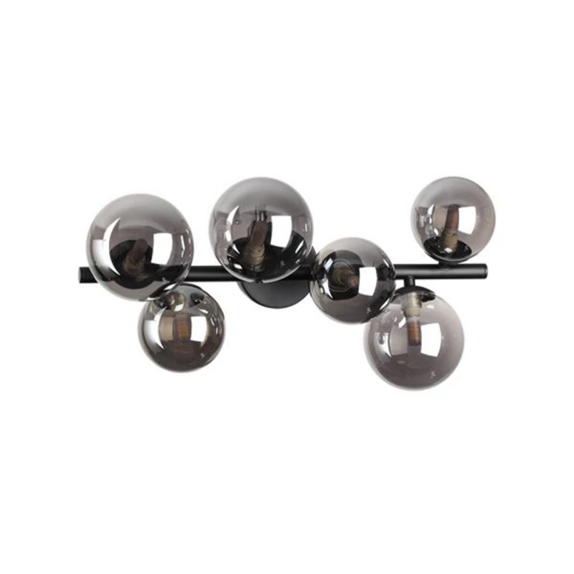 Perlage 6-bulb ceiling light with black structure and smoked glass The Perlage ceiling lamp is fitted with a black metal arm to which a total of six lampshades are attached. These are oriented in different directions and are each designed in a spherical shape made of smoked grey tinted glass. Warm white G9 LED bulbs are already included in the scope of delivery.
