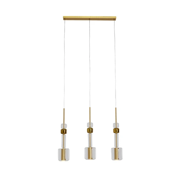 3-bulb Candy Bar pendant light - stylish interplay of clear glass and gold-coloured metal The Candy Bar pendant light is particularly suitable as an elegant source of light above tables and counters. Three lampshades are lined up underneath a long canopy, combining gold-coloured steel elements with clear glass. A GU10 socket is integrated on the underside of each shade so that the light is emitted downwards.